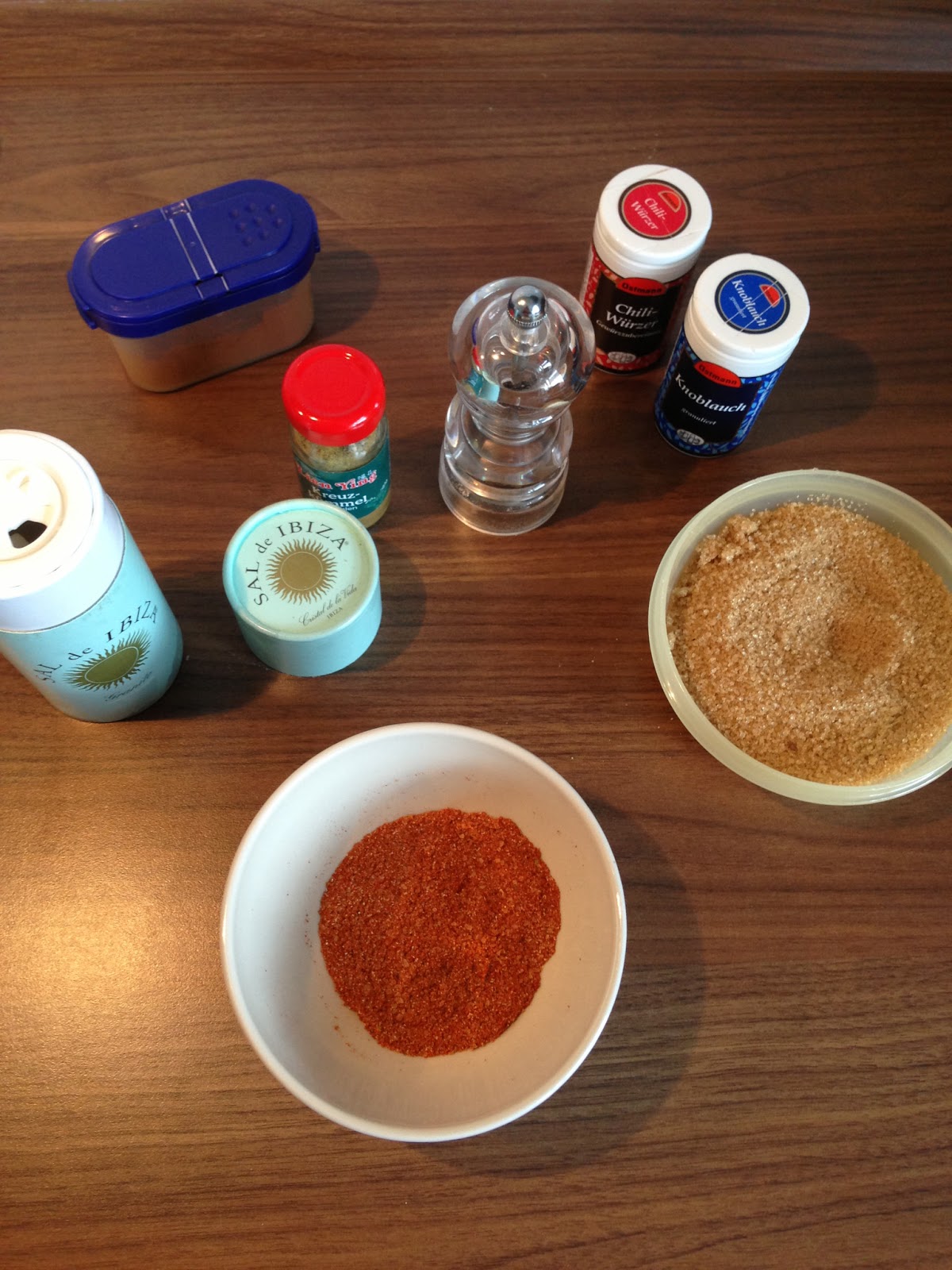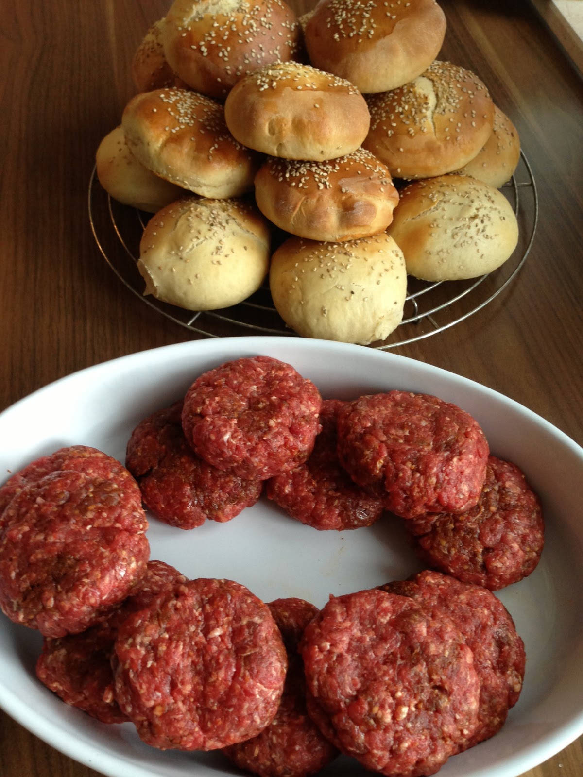 Das Fleisch mit den Gewürzen gut vermengen und 12 Burger formen, kalt stellen. Gut platt drücken, denn auf dem Grill ziehen sie sich sehr zusammen und werden mächtig. Wir haben das Fleisch nach dem grillen halbiert, sonst hätten wir die Burger nicht essen können!