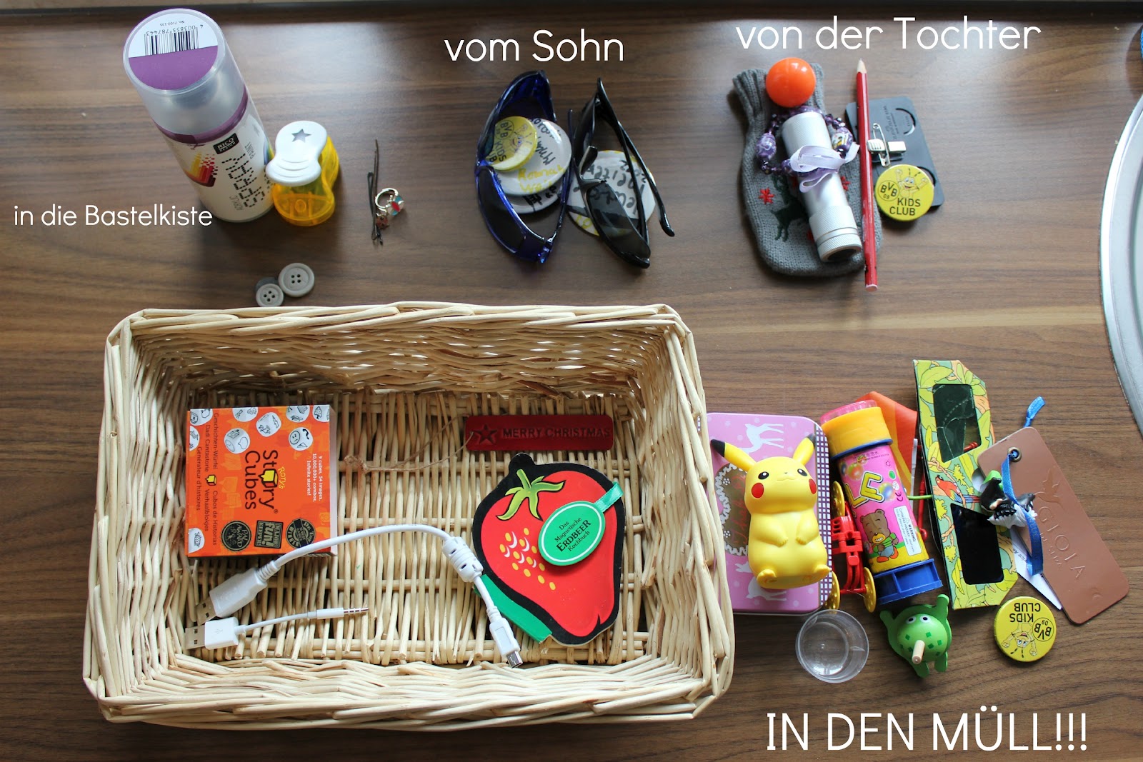 In diesen Korb lege ich z.B. auch immer Kleinigkeiten aus dem Ü-Ei … nach einer Woche denken die Kids nicht mehr dran & ich kann sie WEG SCHMEISSEN, ohne einen Tobsuchtsanfall zu riskieren …