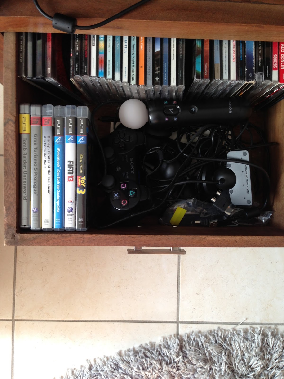 Das Schöne an meiner Entrümplungsaktion: die Playstationspiele der Kinder haben jetzt Platz in der Schublade und stauben nicht mehr in dem Korb ein, der auf dem Schrank steht!