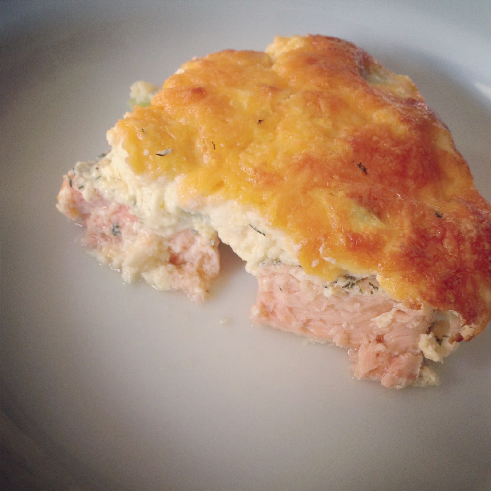 Über den Lachs geben und mit 50 g geriebenen Cheddar bestreuen
