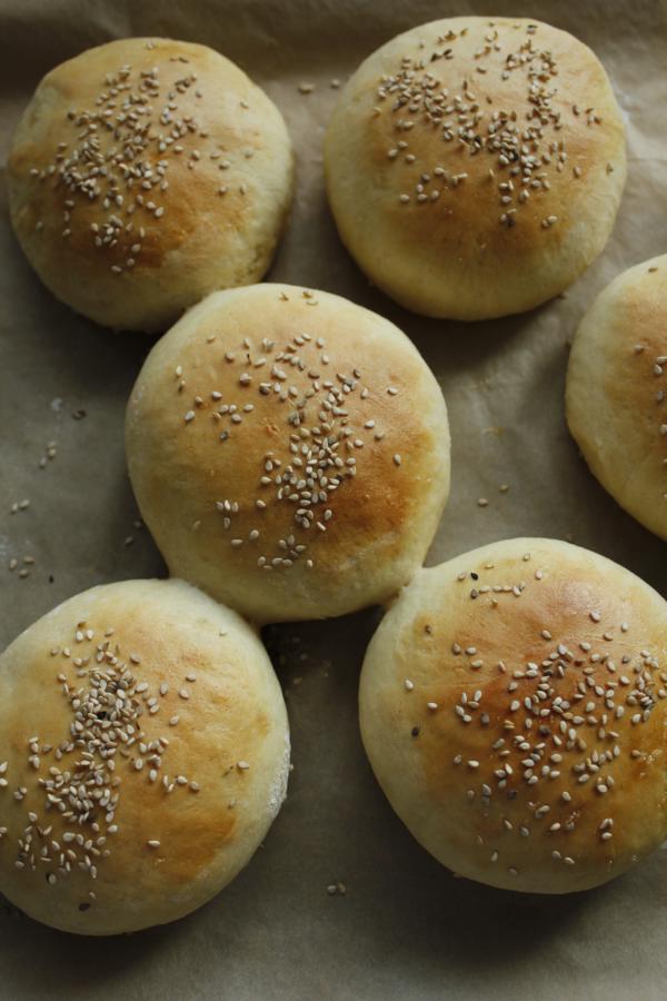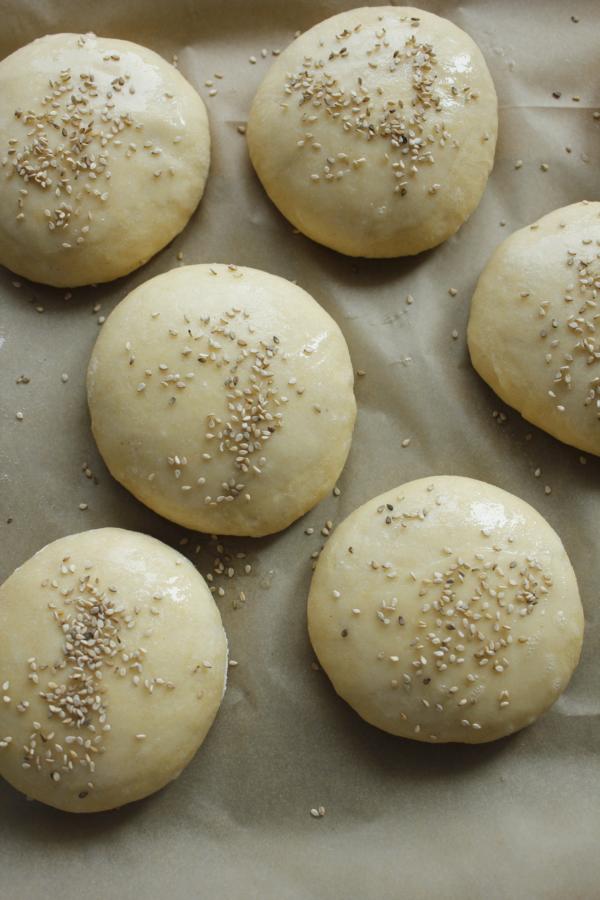 die Brötchen damit bestreichen & mit Sesam bestreuen