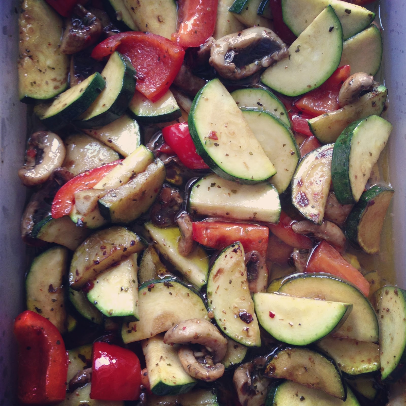 Gemüse in eine Schale geben und mit so viel Öl begießen, dass das Gemüse bedeckt ist.