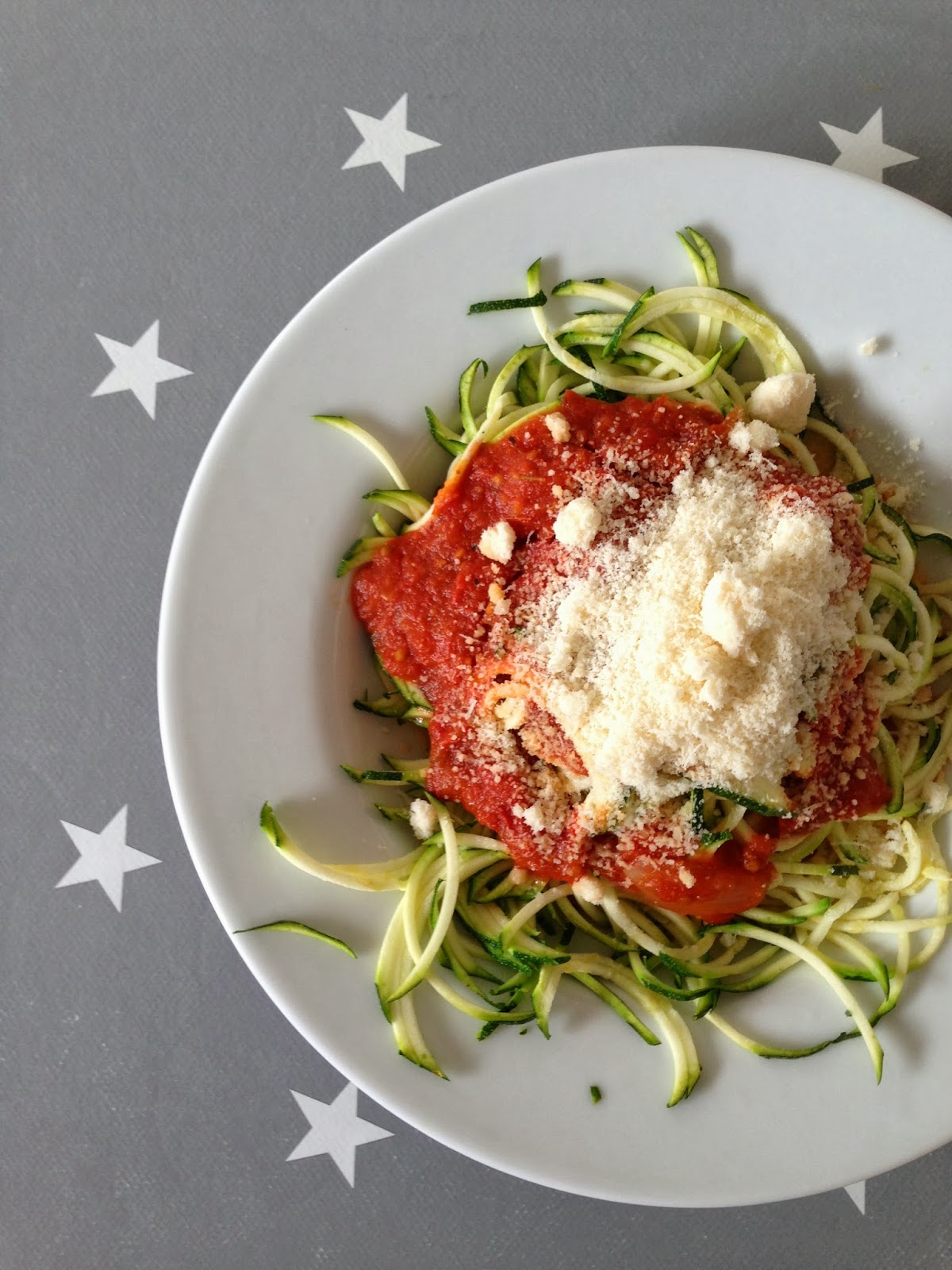 So habe ich dann gestern eine Zucchini in Spaghetti verwandelt, ein Glas von meiner selbstgemachten Ofengerösteten-Tomatensosse (nach DIESEM Rezept) geöffnet, beides zusammen 2 Minuten in die Mikrowelle gestellt & vor dem Verzehr einen Haufen Parmesan darüber gestreut – bis dahin habe ich NICHT daran geglaubt, dass das schmecken würde!!!